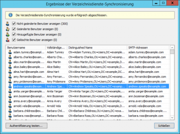 Um die Synchronisierung letztendlich durchzuführen, klicken Sie auf Synchronisieren. Das Ergebnis wird dann mit allen an der MailStore Server-Benutzerdatenbank vollzogenen Änderungen angezeigt.