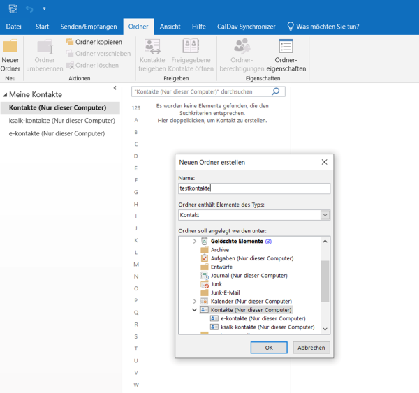 Für einen neuen Kontakte Ordner unter Kontakte Ordner / Neuer Ordner einen neuen Kontakte Ordner erstellen: