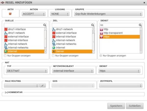 Damit externe Nutzer auf den Server nun auch zugreifen können, muss eine Firewall-Regel mit Destination NAT angelegt werden.