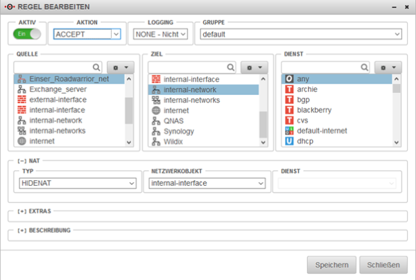 Jetzt auf Portfilter bei Aktion „ACCEPT“ als Quelle das virtuelle VPN Netz wählen als Ziel „internal-network“ als Dienst „any“. Unten bei NAT auf Typ HIDENAT und Netzwerkobjekt internal-interface.