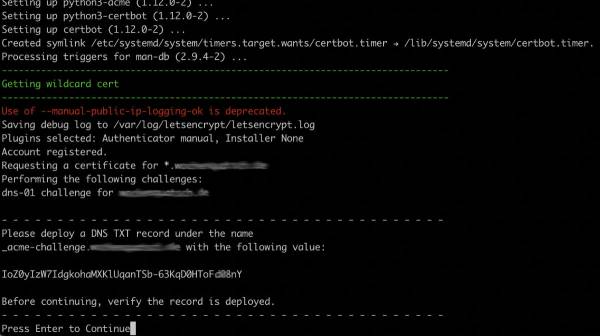Danach müsst ihr die Fragen im Installer zu eurer Domain beantworten. Danach startet der Installer und erstellt den Server. TXT-Eintrag im DNS-Manager für Let’s Encrypt Wildcard-Zertifikarte