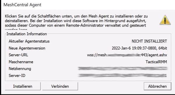 Am Schluss wird eine URL angezeigt. Diese müsst ihr in einem Browser kopieren. Ihr könnt die URL im Browser eines Windows Clients herunterladen und dort den Mesh Client runterladen und installieren. Beachtet das euer Virenscanner die Installation verhindern kann und ihr eine Ausnahme definieren müsst.