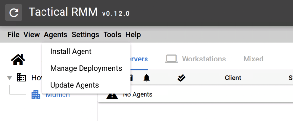 Nun können wir den ersten Windows Client mit dem Tactical Agent installieren, klicke auf Agent und Install Agent in der Navigation.