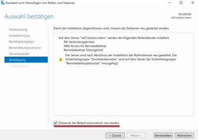 Aktiviere die Checkbox bei „Zielserver bei Bedarf automatisch neu starten“ und klicke auf „Bereitstellen“