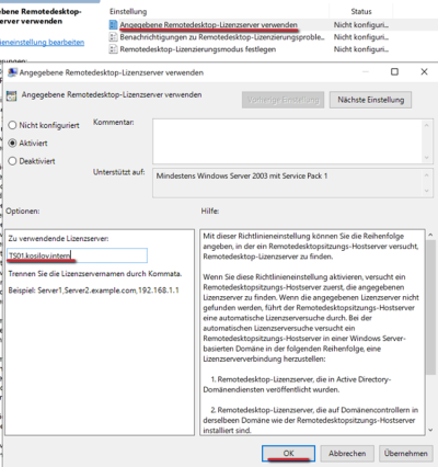 Wähle die erste Gruppenrichtlinie „Angegebene Remotedesktop-Lizenzserver verwenden“, aktiviere diese und gib den Namen deines Servers ein, du kannst auch einfach die IP-Adresse hier eintragen.