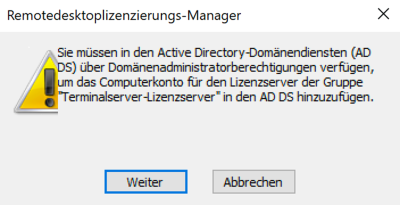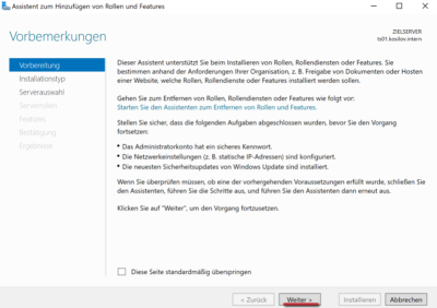 Wir werden darauf hingewiesen, dass wir Domänenadministratorenberechtigungen benötigen, diese haben wir aber bereits weiter oben festgelegt und können hier auf „Weiter“ klicken.