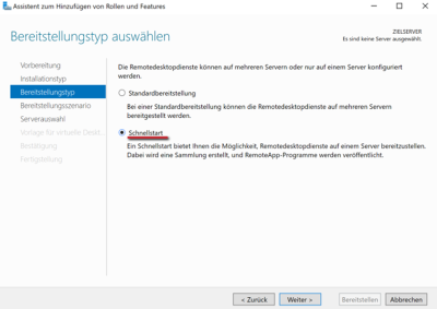 Aktiviere die Checkbox bei „Schnellstart“, da wir erst einmal nur einen RDS Server installieren möchten und bei diesem Punkt alles was benötigt wird mit installiert wird und klicke auf „Weiter >“.