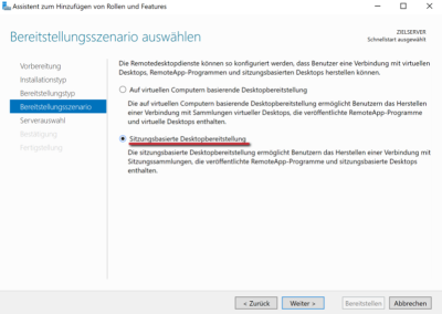 Wähle „Sitzungsbasierte Desktopbereitstellung“ und klicke auf „Weiter >“.