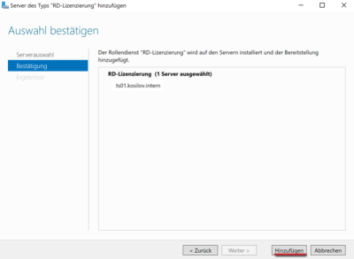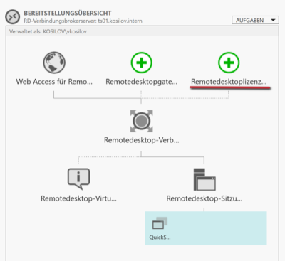 Du siehst eine Bereitstellungsübersicht, diese zeigt was der Server für dich bereits alles installiert hat. Hier fehlt uns aber die „Remotedesktoplizenzierung“, du kannst diese auch auf einem anderen Server installieren. In diesem Guide installieren wir sie aber auf dem RDS-Server. Klicke auf „Remotedesktoplizenzierung“