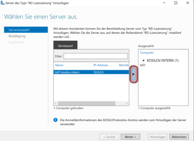 Kontrolliere ob dein Servername sowie die IP Adresse korrekt ist und füge den Server unter „Ausgewählt“ hinzu insofern dies nicht automatisch passiert ist und klicke auf „Weiter >“.