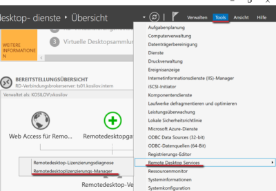 Nach der Installation kannst du das Fenster schließen. Du hast nun in deinem Server-Manager unter Tools einen neuen Punkt. Unter „Remote Desktop Services“ findest du jetzt den Punkt „Remotedesktoplizenzierungs-Manager“, öffne diesen.