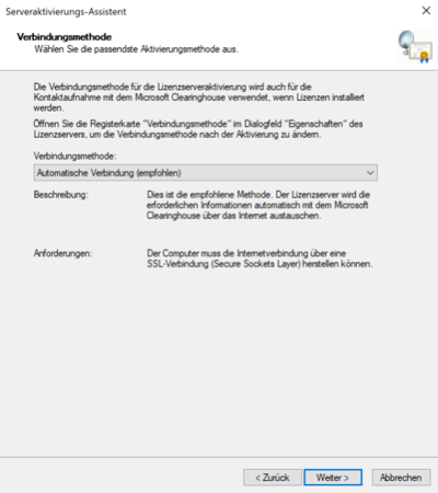 Wähle hier die Verbindungsmethode „Automatische Verbindung (empfohlen)“, ich hatte schon des Öfteren den Fall, dass diese Methode nicht funktioniert. Sollte dies bei dir der Fall sein, musst du bei Microsoft anrufen und diese Anmeldung mithilfe eines Mitarbeiters durchführen. Klicke auf „Weiter >“.