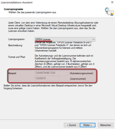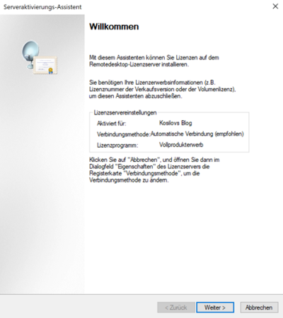 Wähle nun, welches Serverbetriebssystem du hast und wie du lizenzierst (In der Gruppenrichtlinie, die wir oben erstellt haben, muss das gleiche eingestellt sein). Gib dann deine Anzahl an verfügbaren Lizenzen ein und klicke wieder auf „Weiter >“.