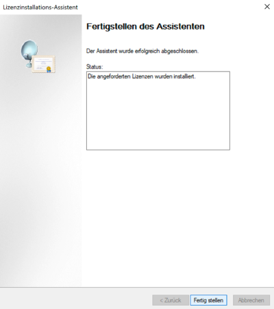 Wenn alles funktioniert hat, erhältst du den Status „Der Lizenzserver wurde aktiviert“. Aktiviere den Hacken bei „Assistent für die Lizenzinstallation starten“ und klicke auf „Weiter >“. Es öffnet sich direkt der Assistent in dem du erst einmal wieder auf „Weiter >“ klickst.