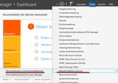 Wir sind nun fertig, um zu kontrollieren ob du alles richtig gemacht hast öffne den „Server-Manager“ und klicke oben rechts auf „Tools → Remote-Desktop-Services → Remotedesktop-Lizenzierungsdiagnose“