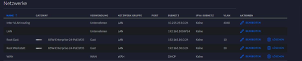 Bei Unifi ist das VLAN Interrouting grundsätzlich zuerst AKTIVIERT und die VLANS können so untereinander kommunizieren. Daher werden auch Firewallregeln angelegt, die nicht veränderbar sind und dieses inter- VLAN Routing bereitstellen (Siehe Bild)
