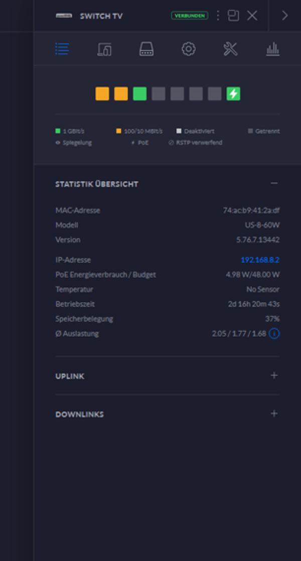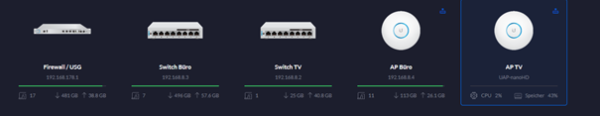 Alle eingebundenen Geräte könnten unter dem Menüpunkt „Geräte“ eingesehen werden. Die Geräte können dort verwaltet werden, es können Aliase (AP- Büro 1, Backbone Untergeschoss usw. ) vergeben werden und Daten eingesehen werden wie Stromverbrauch, aktive Ports, PoE Stati eines Ports und Firmwarestand.